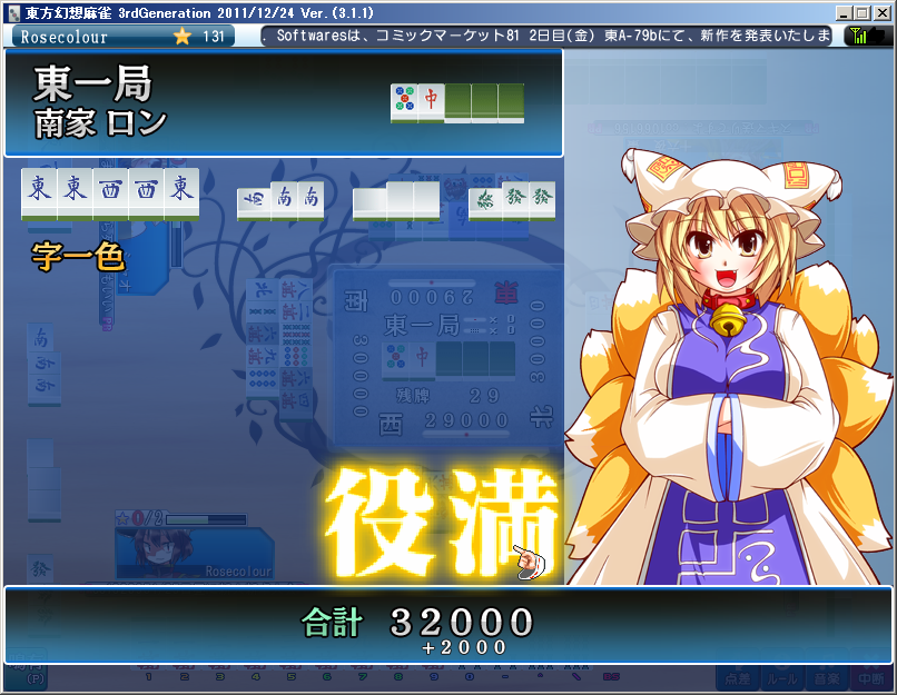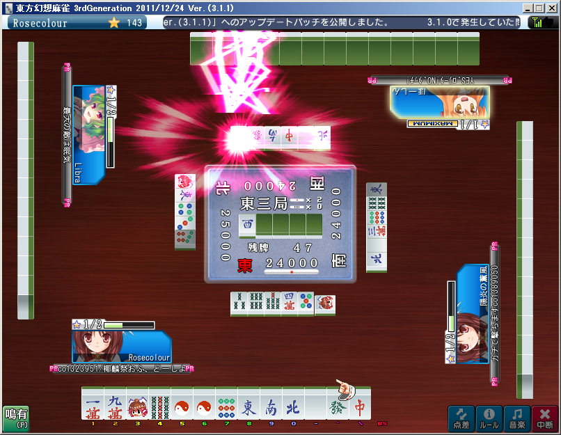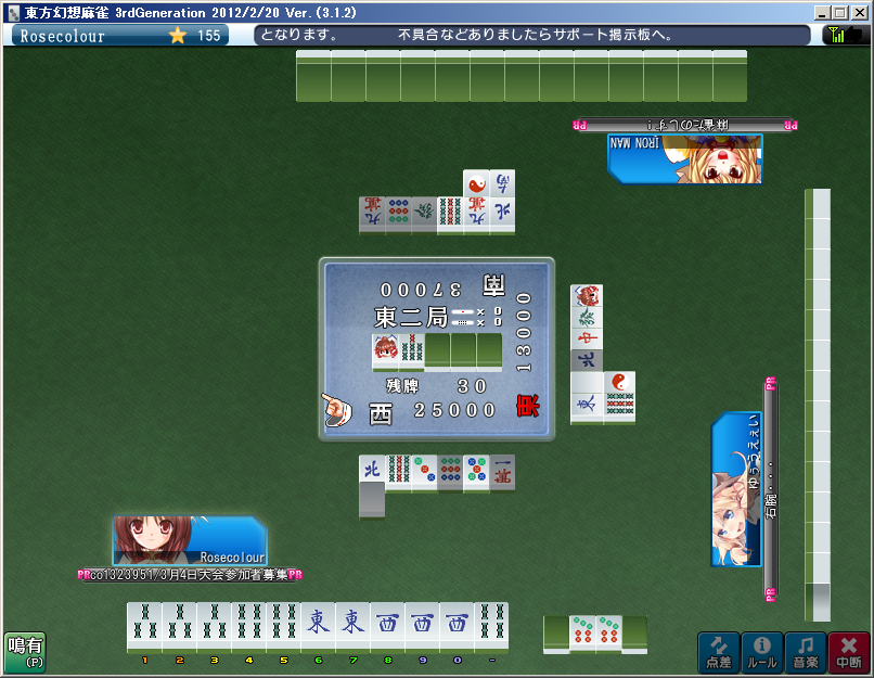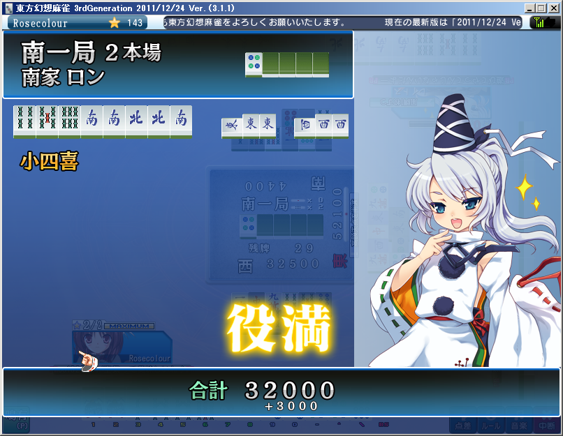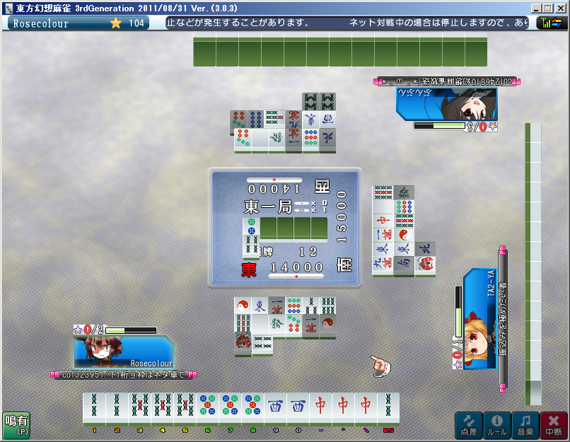 | 142輪目 | 香霖堂 | ろぜからー | 国士無双 | 橙 | ロン和了り |