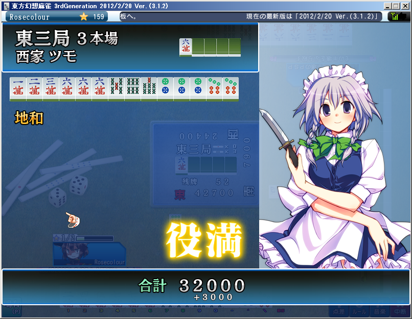 | 226輪目 | 人間の里 | 半壊のPSPさん | 地和 | 十六夜 咲夜 | ツモ和了り |