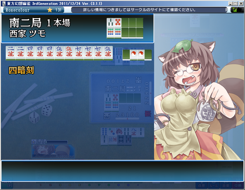 | 26輪目 | 白玉楼 | ろぜからー | 四暗刻 | 橙 | ツモ和了り |